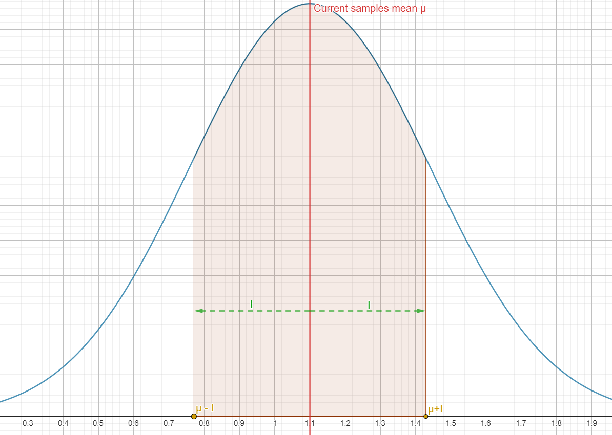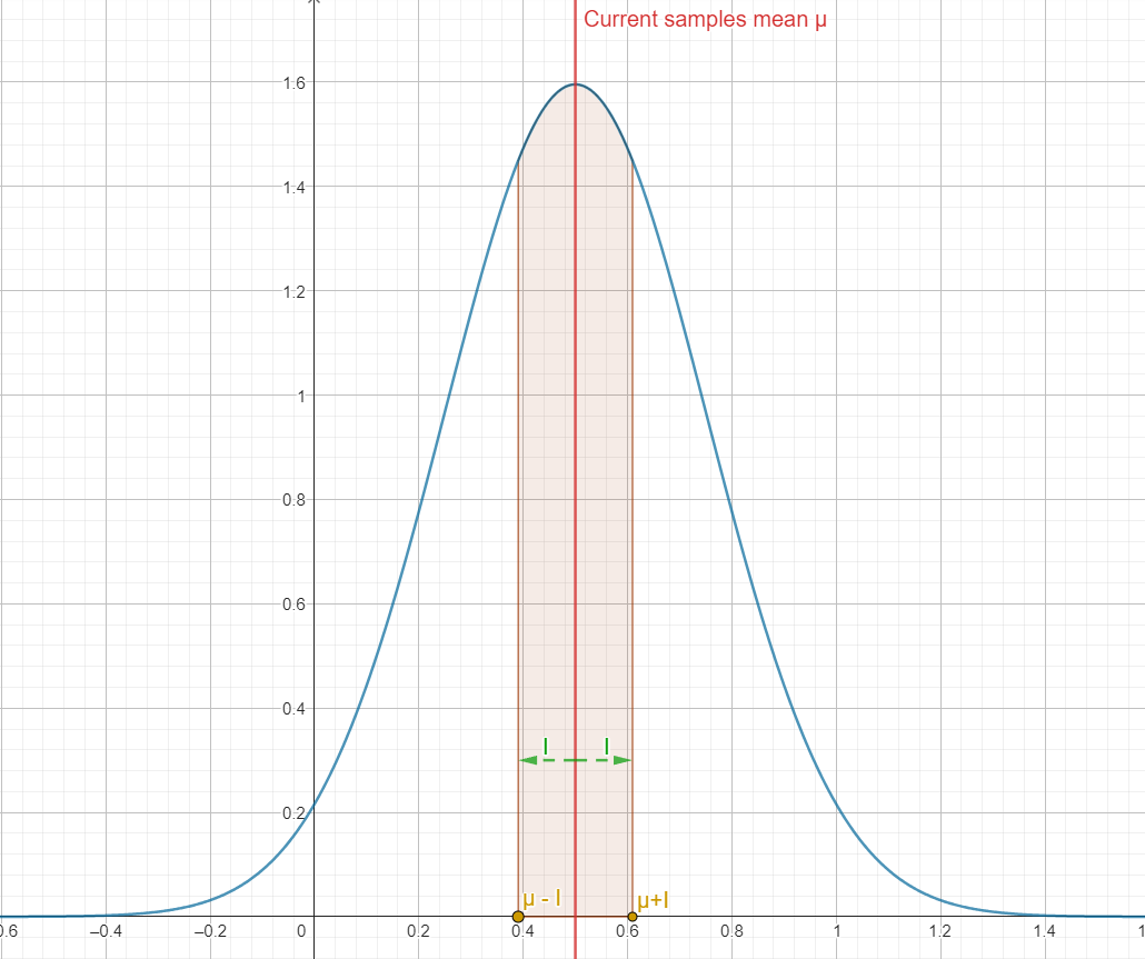 \[I = 1.96 \frac{\sigma}{\sqrt{N}}\]This 95% confidence interval gives us a range around our samples mean \(\mu\) and we can be 95% sure that, for the current number of samples \(N\) and and their variance \(\sigma\) that we used to compute this interval, the converged mean (true mean) of an infinite amount of samples is in that interval.
